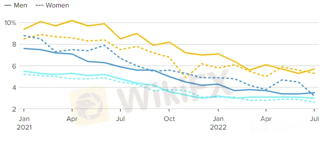 与此同时,追踪有多少人就业或寻找工作的劳动力参与率从 6 月份的 62% 上升至 7 月份的 62.3%。然而,男性的这一比例有所下降,7 月份降至 67.3%,而前一个月为 68.1%。