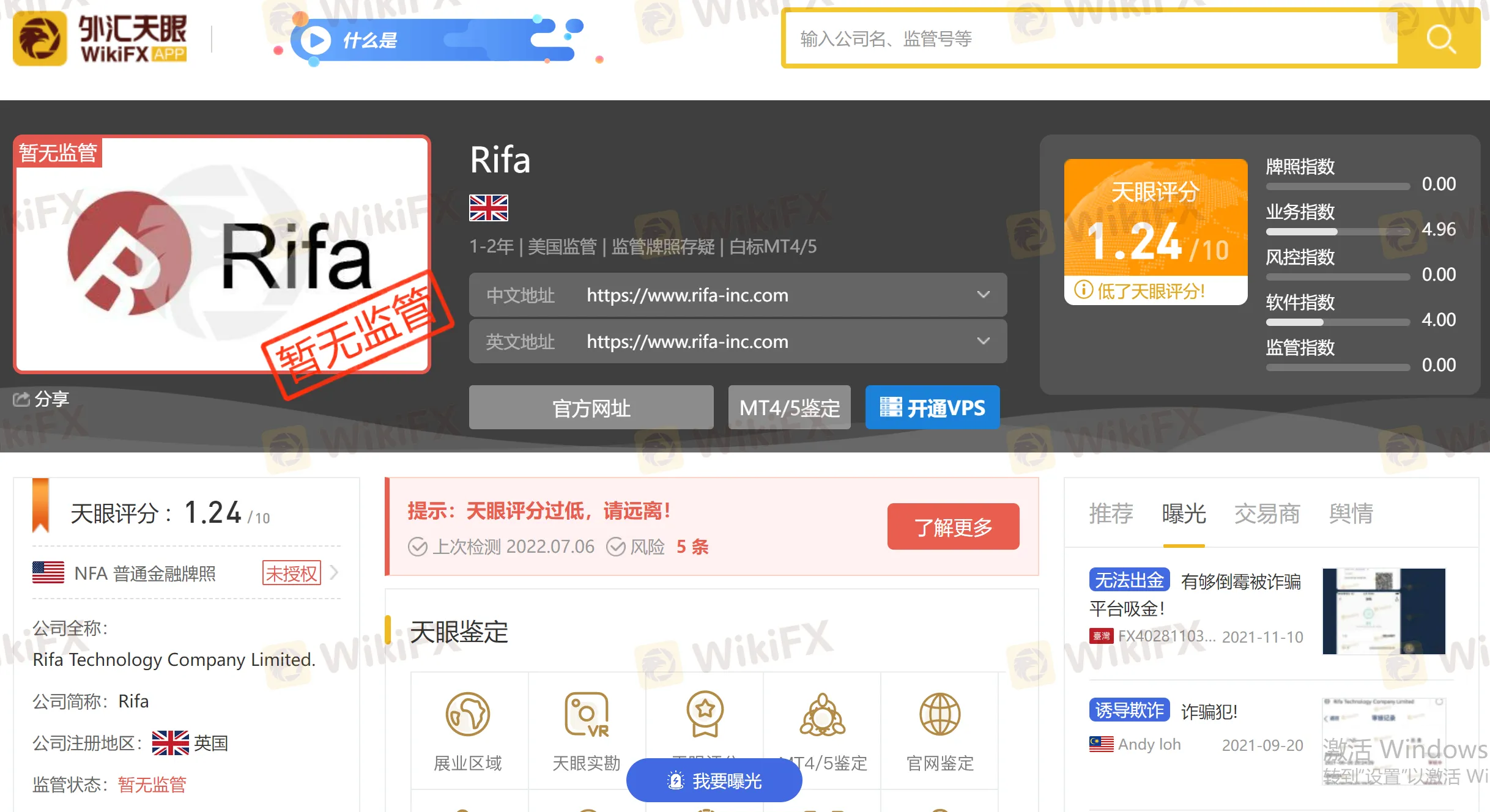 其实有很多方法可以避免出现这样的情况,在做外汇和其他交易之前,可以在我们外汇天眼上面先检索一下该平台是否可靠,就拿RIFA平台举例,在天眼首页搜索RIFA可以得出如下结果: