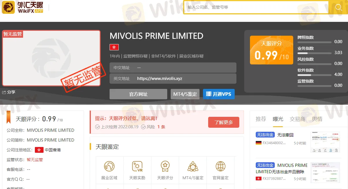 其实有很多方法可以避免出现这样的情况,在做外汇和其他交易之前,可以在我们外汇天眼上面先检索一下该平台是否可靠,就拿MIVOLIS PRIME LIMITED平台举例,在天眼首页搜索MIVOLIS PRIME LIMITED可以得出如下结果: