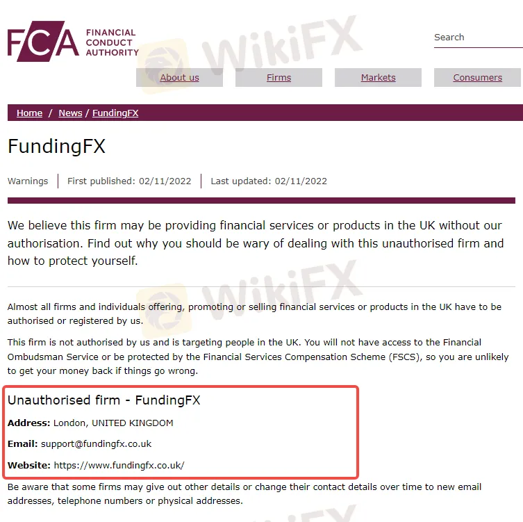 FCA警告称:FundingFX在未经我们授权的情况下在英国提供金融服务或产品,如果一旦遭受资金损失,您将无法使用金融申诉专员服务或受到金融服务补偿计划 (FSCS) 的保护。