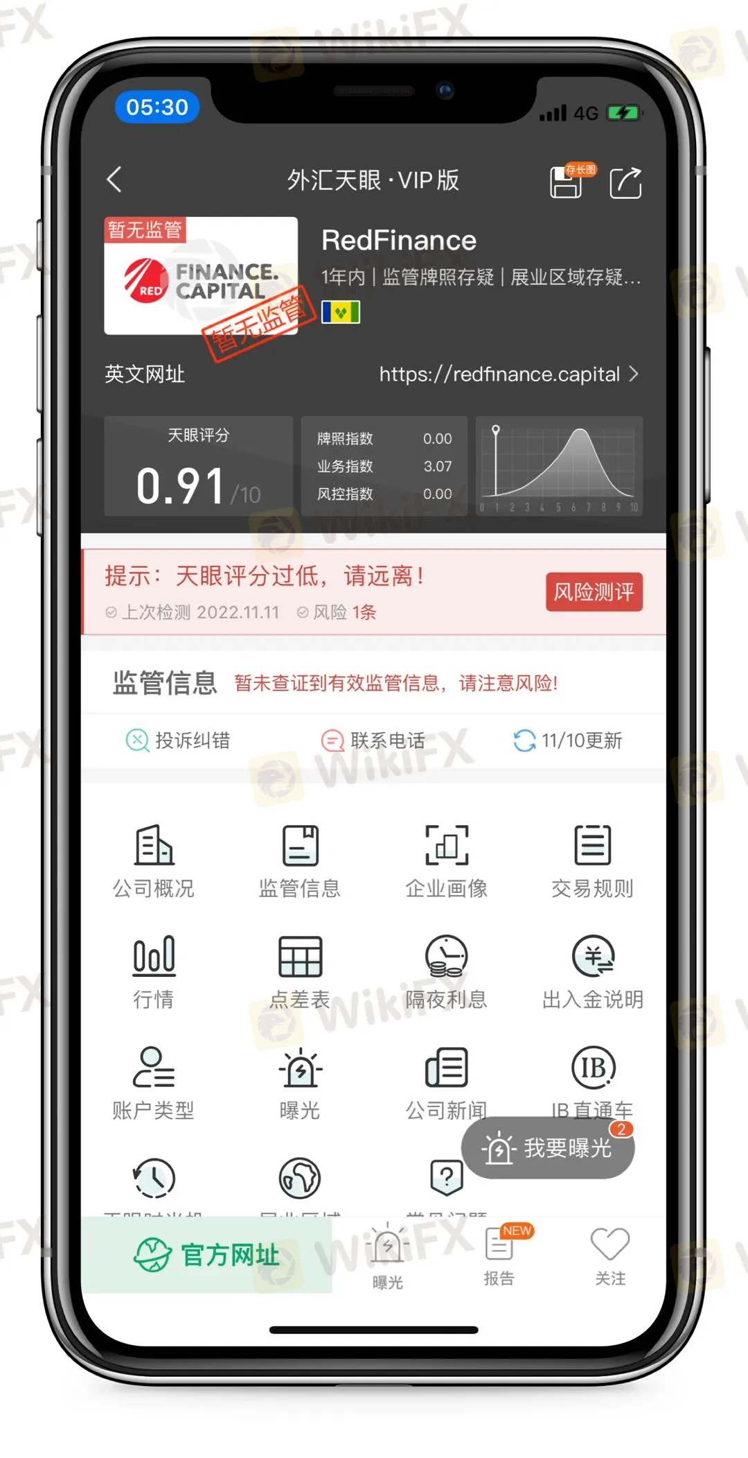 其实有很多方法可以避免出现这样的情况,在做外汇和其他交易之前,可以在我们外汇天眼上面先检索一下该平台是否可靠,就RedFinance平台举例,在天眼首页搜索RedFinance可以得出如下结果