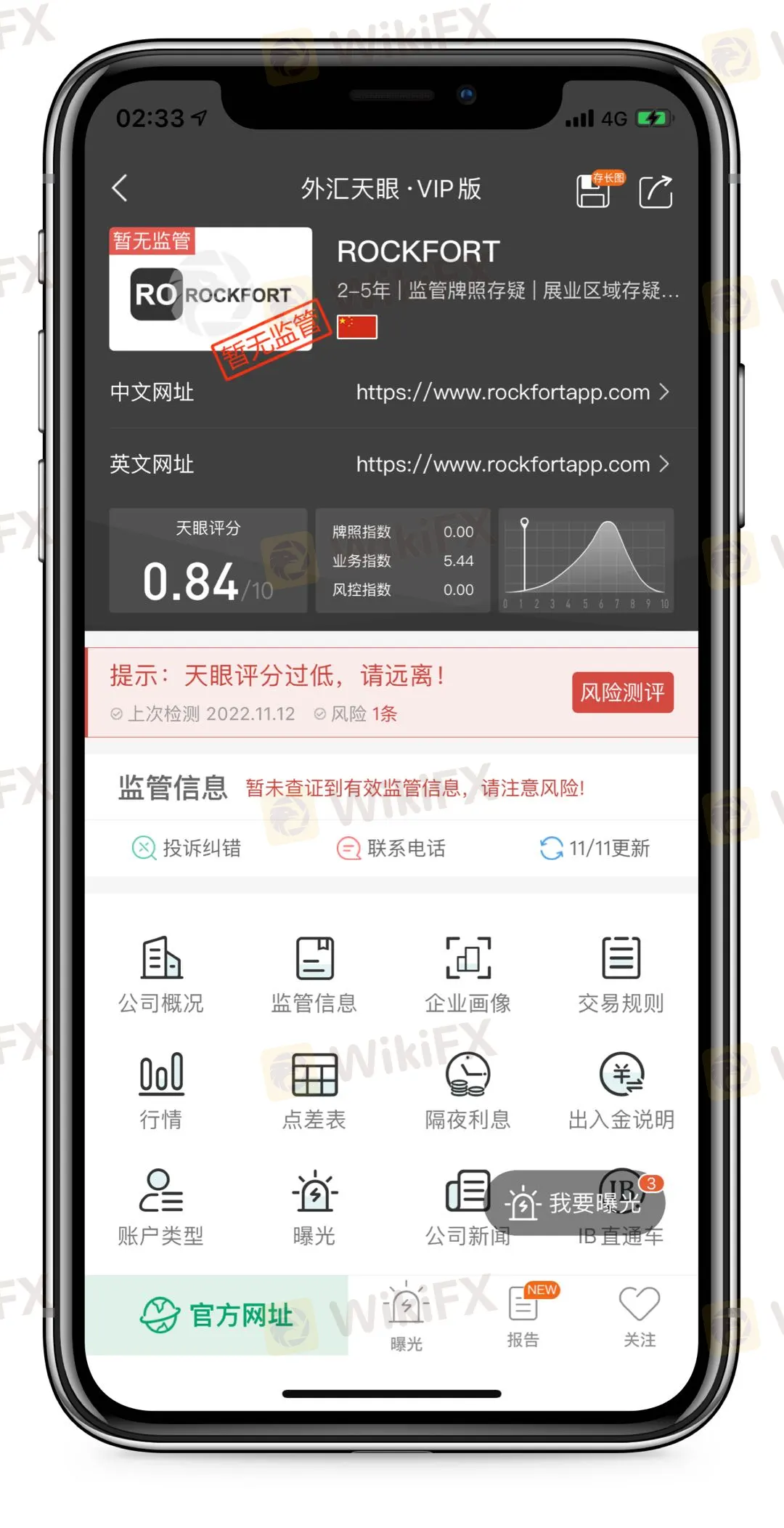 其实有很多方法可以避免出现这样的情况,在做外汇和其他交易之前,可以在我们外汇天眼上面先检索一下该平台是否可靠,就ROCKFORT平台举例,在天眼首页搜索ROCKFORT可以得出如下结果