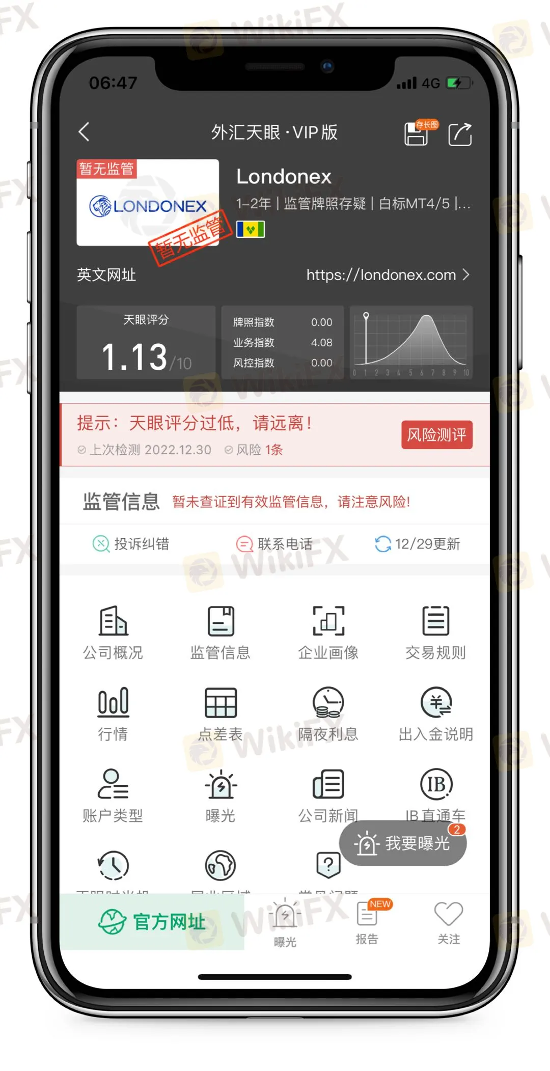 其实有很多方法可以避免出现这样的情况,在做外汇和其他交易之前,可以在我们外汇天眼上面先检索一下该平台是否可靠,就Londonex平台举例,在天眼首页搜索Londonex可以得出如下结果