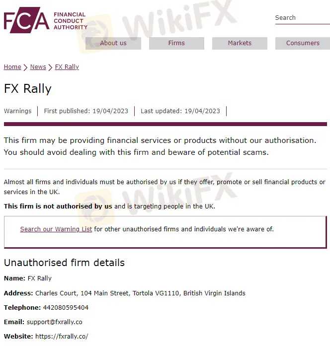 FCA警告称:FX Rally 在未经我们授权的情况下在英国提供金融服务或产品,如果一旦遭受资金损失,您将无法使用金融申诉专员服务或受到金融服务补偿计划 (FSCS) 的保护。