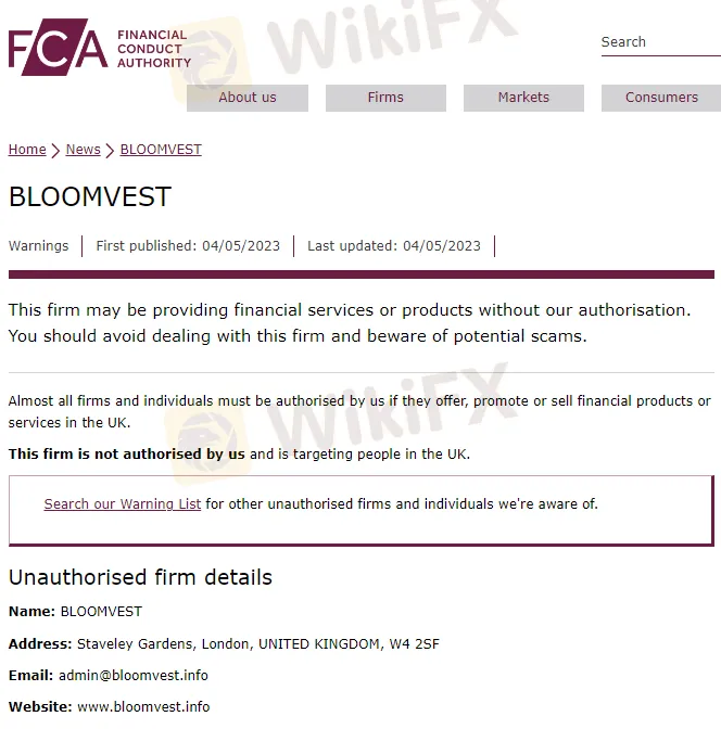 根据外汇天眼监测,5月4日,英国金融行为监管局( FCA )对 BLOOMVEST 发出警告,提示投资者警惕与这家未经授权的公司打交道。