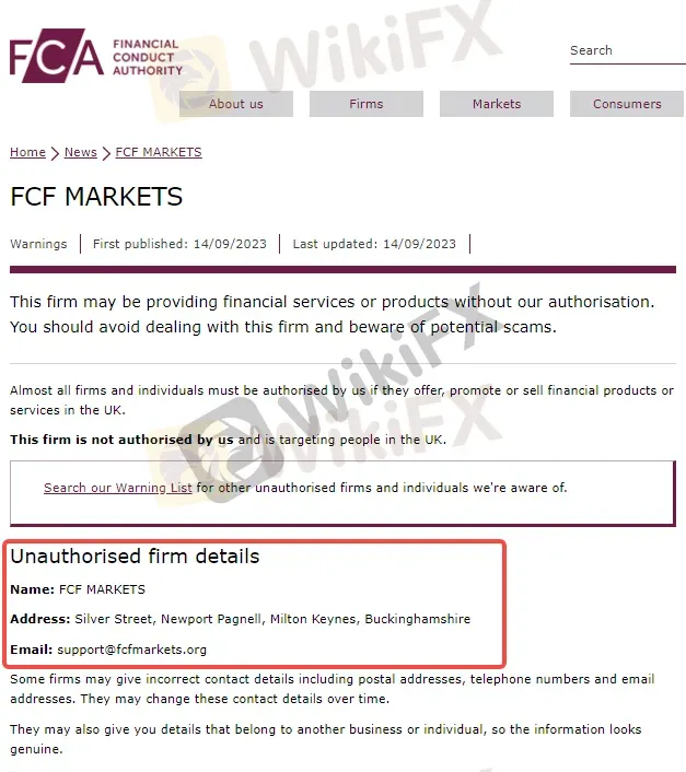 FCA认为FCF MARKETS公司存在欺诈投资者、非法集资等严重违法行为的可能。并警告投资者不要与该公司进行任何交易或投资,如果一旦遭受资金损失,将无法使用金融申诉专员服务或受到金融服务补偿计划 (FSCS) 的保护。