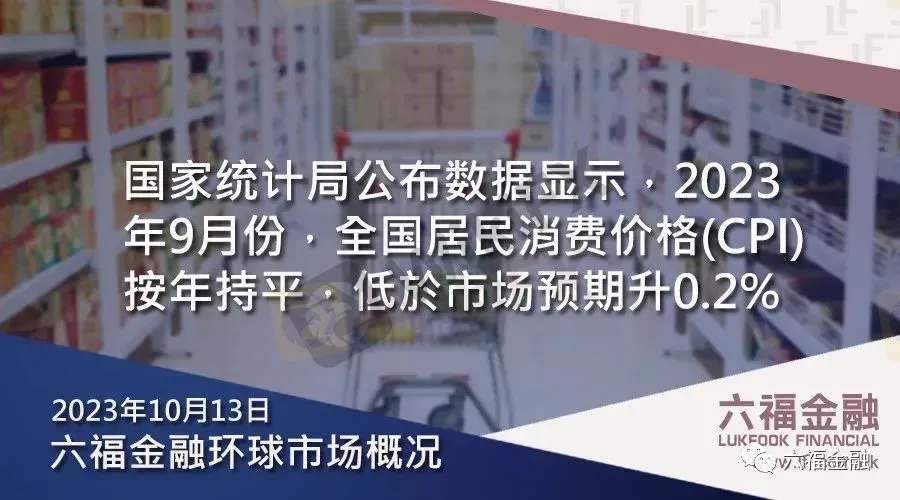 国家统计局公布数据显示,2023年9月份,全国居民消费价格(CPI)按年持平,低於市场预期升0.2%。