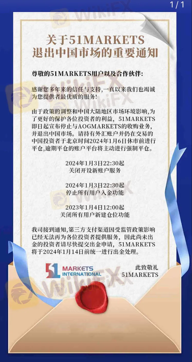 而51Markets在退出中国市场通知上向投资者承诺的2024年1月14号可处理出金俨然是不可能的,所以身在其中的投资者可以抓紧时间拿起法律的武器维权才是正确做法。