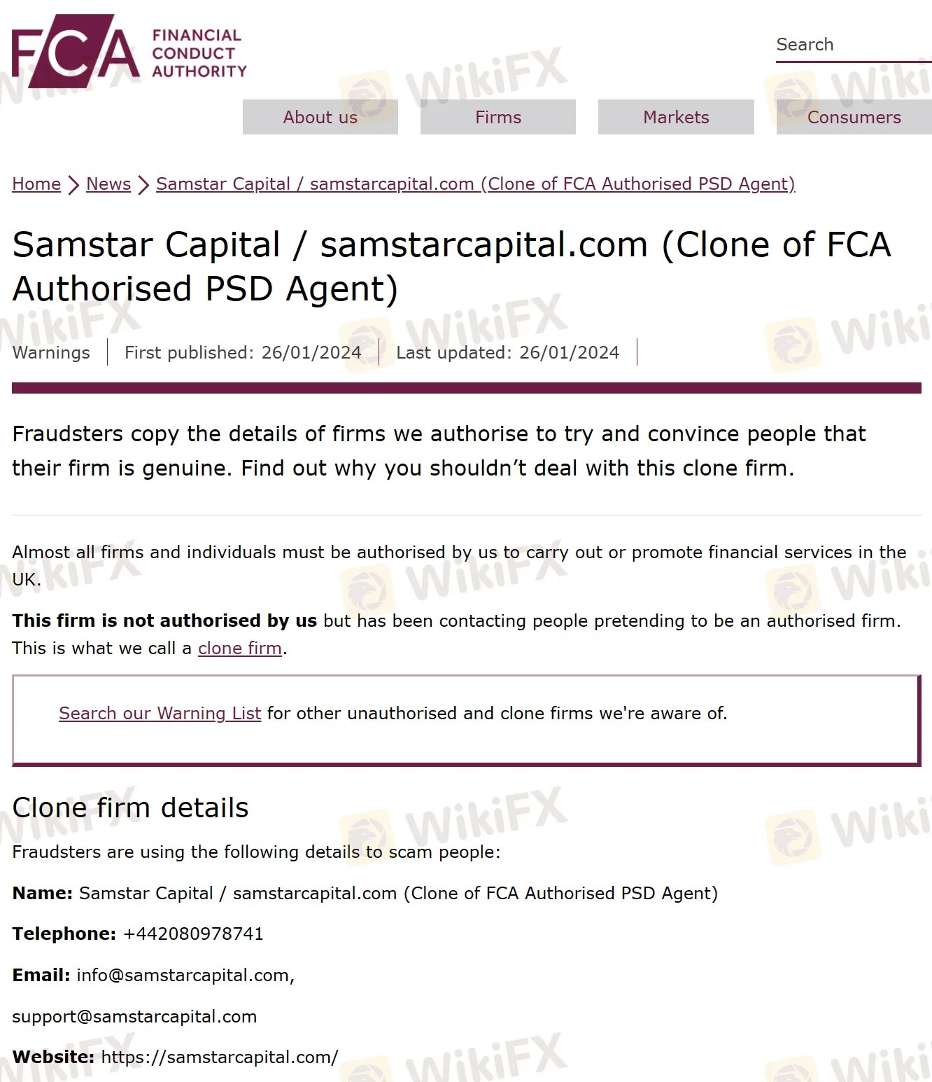 通过WikiFX查询Samstar Capital可知,该平台注册于英国,成立时间1-2年。在监管信息栏明确标记——暂未查证到有效监管信息,监管牌照存疑,展业区域存疑,存在高级风险隐患。