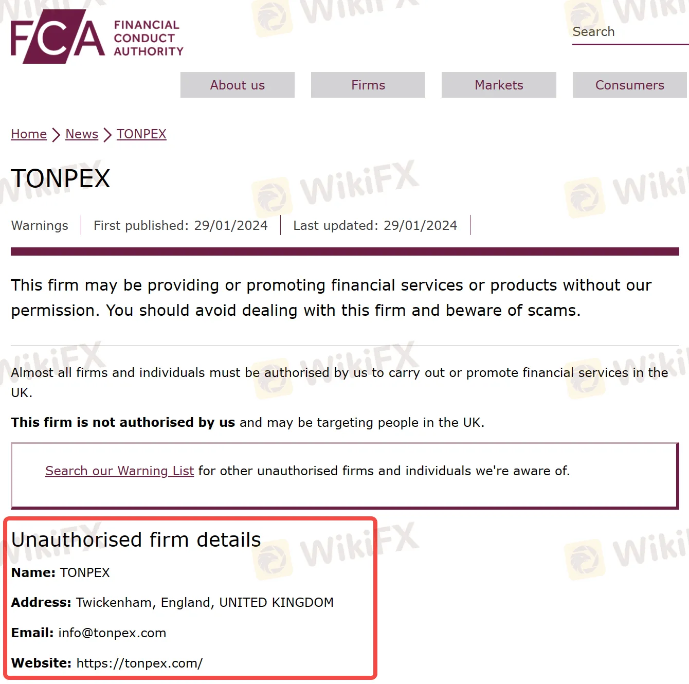 FCA认为TONPEX存在欺诈投资者、非法集资等严重违法行为的可能。并警告投资者不要与该公司进行任何交易或投资,如果一旦遭受资金损失,将无法使用金融申诉专员服务或受到金融服务补偿计划 (FSCS) 的保护。
