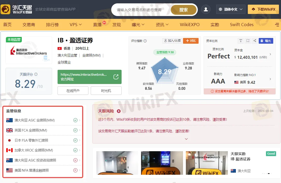 通过外汇天眼查询可知,Interactive Brokers目前受到澳大利亚证券和投资委员会(ASIC)和英国金融行为监管局(FCA)等监管机构的监管,持有澳大利亚证券和投资委员会(ASIC)全牌照(MM)、英国金融行为监管局(FCA)全牌照(MM)、日本金融服务局(FSA)零售外汇牌照以及加拿大投资行业监管组织(IIROC)全牌照(MM)。