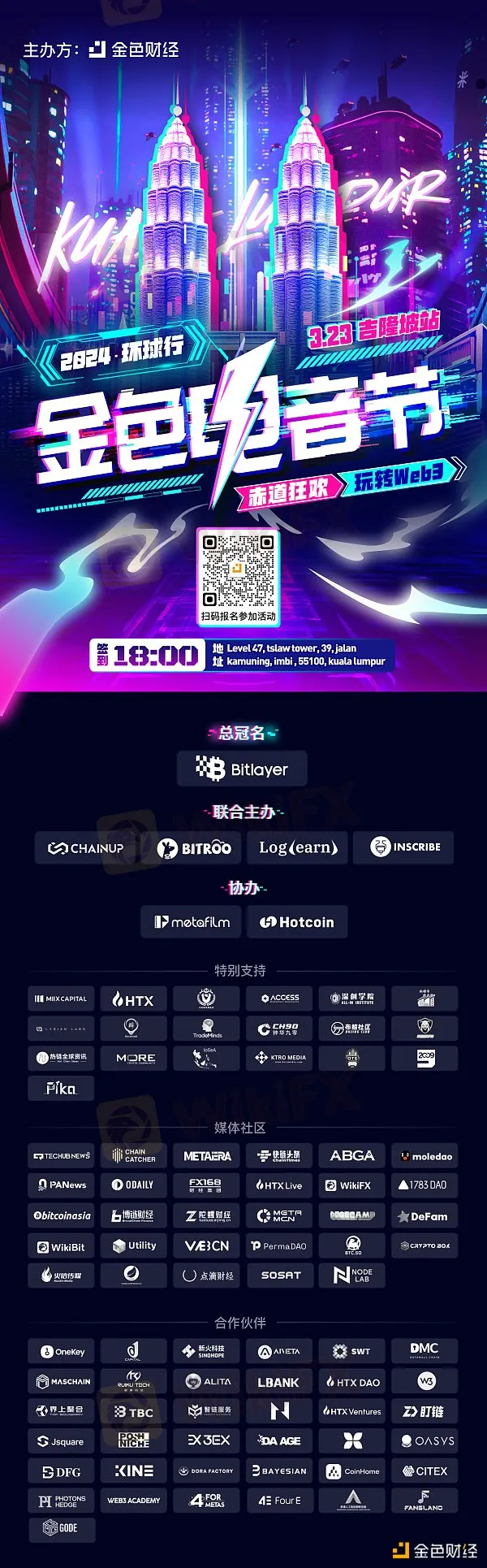 在这一激动人心的时刻,由金色财经主办,Bitlayer总冠名,CHAINUP、Bitroo、Logeran、Inscribe联合主办,Metafilm、Hotcoin协办的金色电音节将带着音乐、Web3和社交的盛宴,于3月23日降临马来西亚吉隆坡,为行业人士带来一场颠覆想象的视听盛宴,奏响加密牛市最强音!
