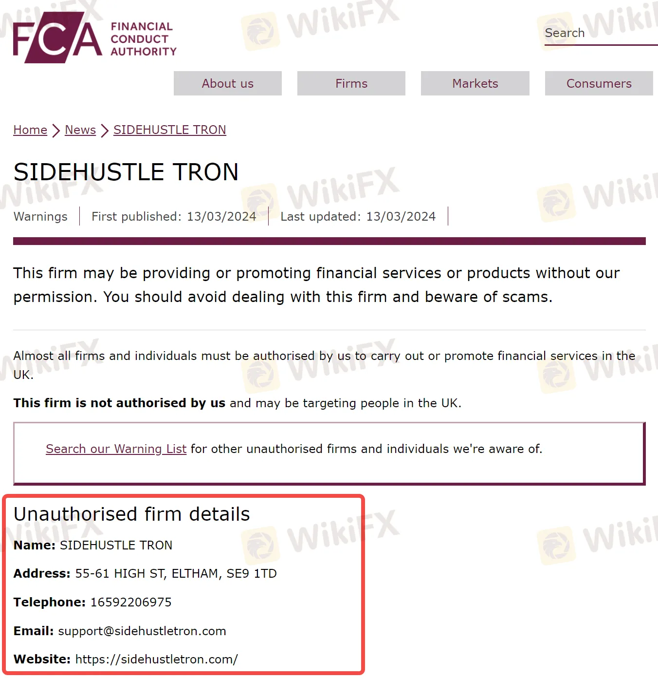 FCA认为SIDEHUSTLE TRON存在欺诈投资者、非法集资等严重违法行为的可能。并警告投资者不要与该公司进行任何交易或投资,如果一旦遭受资金损失,将无法使用金融申诉专员服务或受到金融服务补偿计划 (FSCS) 的保护。
