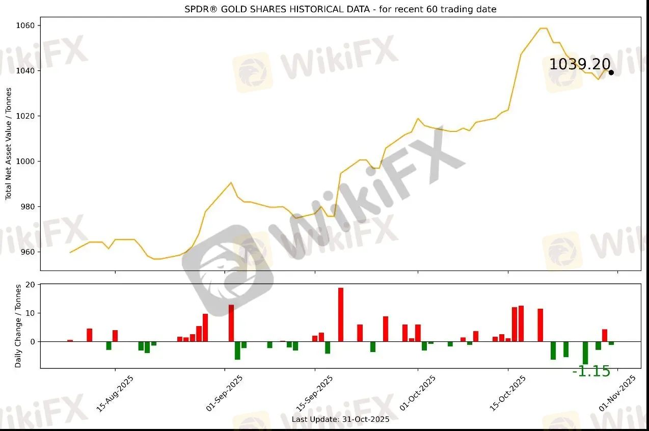 截至10月31日,全球最大的黄金ETF SPDR Gold Trust持仓量为1039.20吨,较上一个交易日减少1.15吨。10月31日现货黄金整体上呈震荡偏弱走势。自4024.429美元/盎司开盘上行至当日高点4046.252美元/盎司,随后跌逾50美元至3990附近,再次回升至4020美元一线,在4000-4030美元区间震荡。美盘交易时间受消息面影响大幅下跌至当日低点3972.55美元/盎司。最终收于4002.69美元/盎司,跌21.615美元或0.54%。