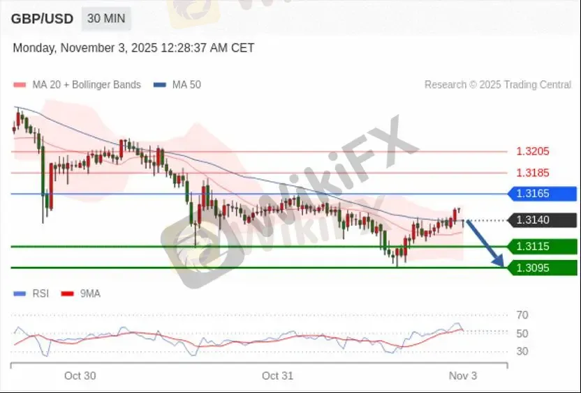 当日内短期关键阻力位在1.3165,转折点在1.3165。