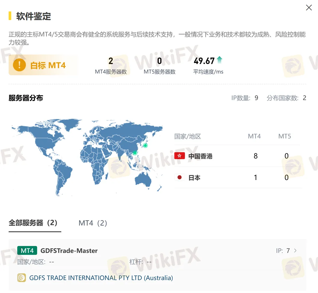 GDFS TRADE使用的是白标MT4,共9个IP其中8个在香港。外汇天眼上关于该平台的曝光均来自中国用户,多个用户均提到GDFS TRADE既是GD金点国际集团。