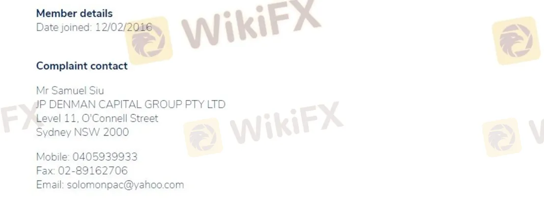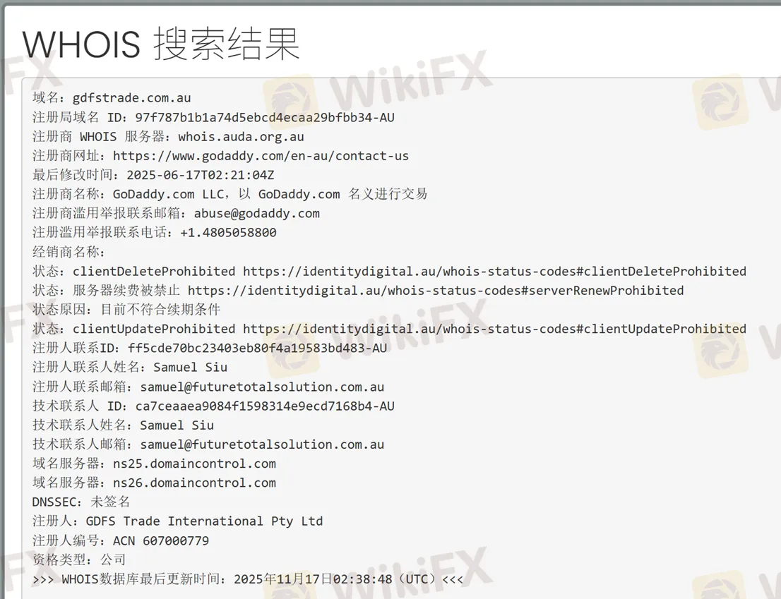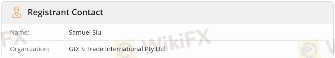 注册人为GDFS TRADE INTERNATIONAL PTY LTD;注册人联系姓名为Samuel Siu(通常译为萧志明),此人曾是该平台曾用名JP DENMAN CAPITAL GROUP PTY LTD的联系人出现在监管信息上。