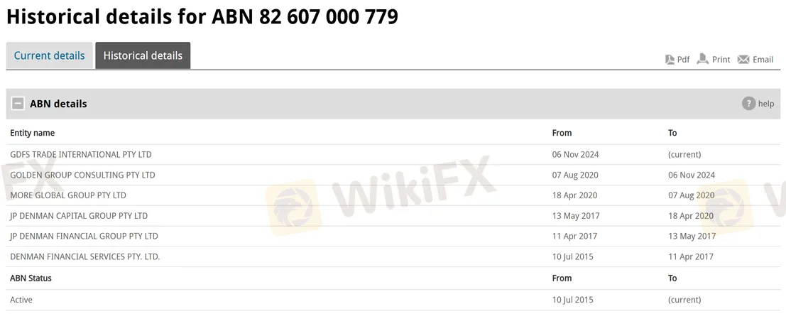 GDFSTRADE常用域名信息如下图,注册日期为2024年7月19日。公司名称由GOLDEN GROUP CONSULTING PTY LTD更名为GDFS TRADE INTERNATIONAL PTY LTD时间为2024年11月6日。