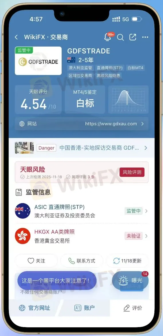 根据外汇天眼收录的信息,GDFS TRADE多次更换公司实体名称以及域名,前后运营近十年。早期宣称是金点国际集团,当前金點貴金屬有限公司网站显示的LOGO和品牌名称与GDFS TRADE网站对应,同时该网站宣称受ASIC监管(同一个监管号)。