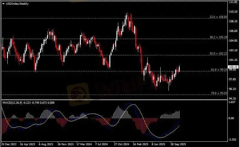 周线图显示美元指数震荡走强,当前收于99.20支撑。从MACD来看,快慢线向上运行,白色动能柱温和放量。指数走势基本和动能柱的变化一致。