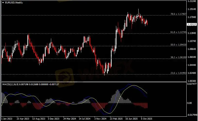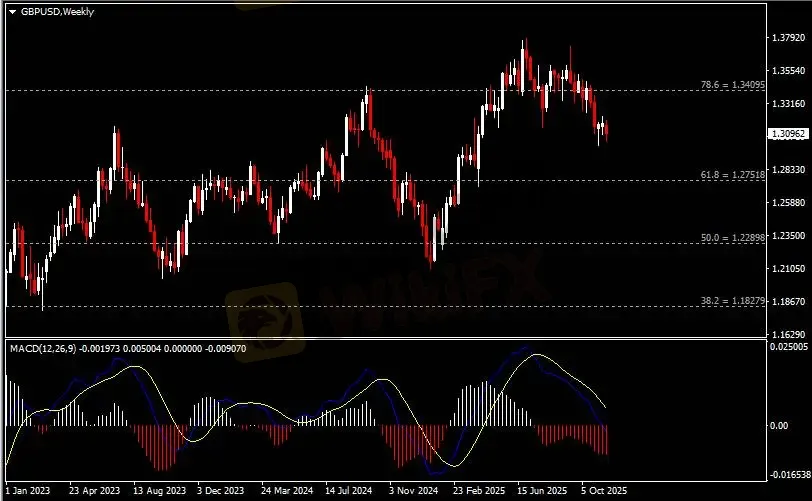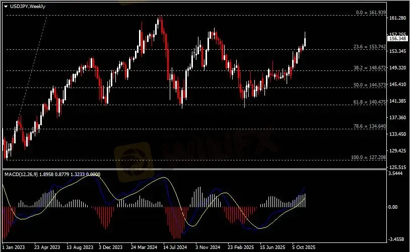 周线图显示美元兑日元震荡上行,当前收于153.70支撑。从MACD来看,快慢线向上运行,白色动能柱温和放量。汇价走势基本和动能柱的变化一致。