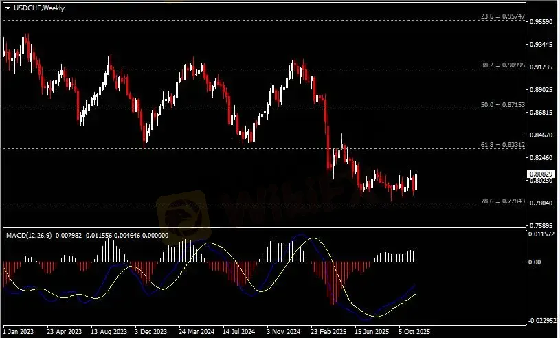 周线图显示美元兑瑞郎反弹上涨,当前企稳于0.7780支撑。 从MACD来看,快慢线向上运行,白色动能柱温和放量。汇价走势基本和动能柱的变化一致。