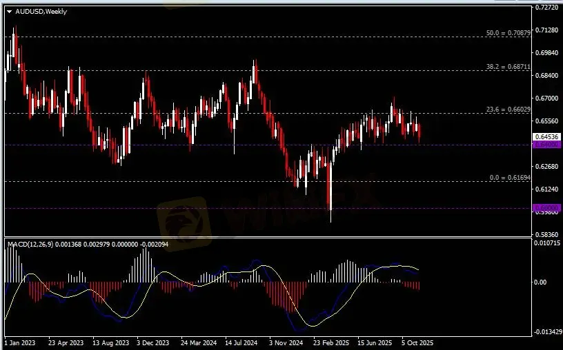 周线图显示澳元兑美元遭遇空头抛售,当前承压于0.66关键阻力。 从MACD来看,快慢线向下运行,红色动能柱温和放量。汇价走势基本和动能柱的变化一致。