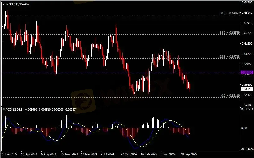 周线图显示纽元兑美元震荡下挫,当前承压于0.58关键阻力。从MACD来看,快慢线向下运行,红色动能柱则温和收缩。汇价走势和动能柱的变化呈分歧。