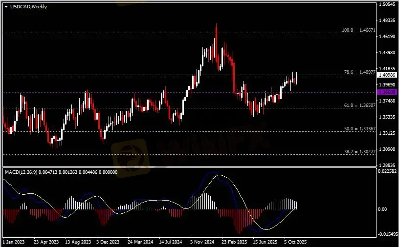 周线图显示美元兑加元震荡上行,当前测试1.41关键阻力。从MACD来看,快慢线向上运行,白色动能柱则温和收缩。汇价走势和动能柱的变化呈分歧。