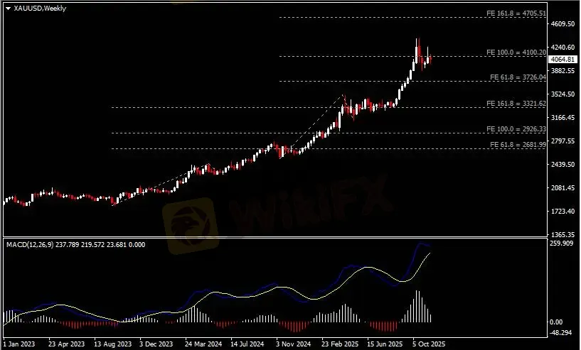 周线图显示金价小幅承压于4100关键阻力。从MACD来看,快慢线呈拐向,白色动能柱温和收缩。金价走势基本和动能柱的变化一致。