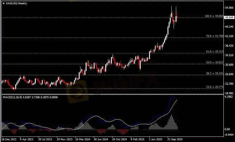 周线图显示银价小幅承压于49.90阻力。从MACD来看,快慢线逐渐收窄,白色动能柱温和收缩。银价走势基本和动能柱的变化一致。