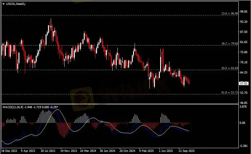 周线图显示油价震荡下挫,当前承压于65.70阻力。从MACD来看,快慢线呈拐向,红色动能柱恢复增量。油价走势基本和动能柱的变化一致。