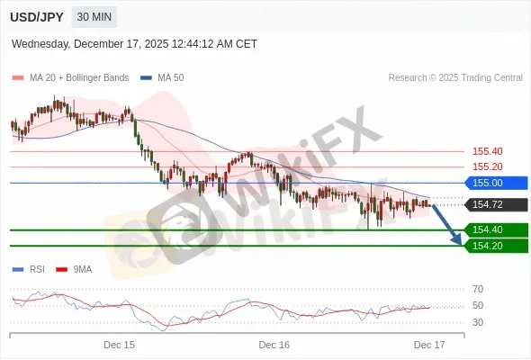 只要155.00阻力位不被突破,向下跌破154.40位置的风险很高。