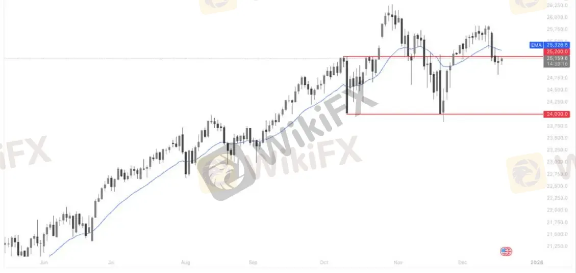 指数当前围绕受到25,200关键位压制 ,该位置同时贴近 20 日 EMA(约 25,326),成为多空分水岭。短线来看,若价格无法有效站稳 25,200 并收复 20 日均线,反弹更可能被视为弱势修复,需警惕回踩 24,800 → 24,000 区间支撑;反之,若放量站上并稳固于 25,200–25,300 上方,结构有望转向高位震荡偏多,进一步上看前高区域。整体仍处于关键选择阶段,方向需等待这一关口的明确突破或失守确认。