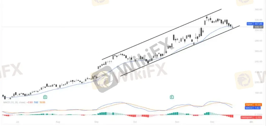 从技术结构看,股价恰好回踩中期上升通道下轨 + 20 日 EMA 共振支撑,并未出现破位放量,属于强趋势中的标准回踩形态。MACD 虽处于回落阶段,但仍在零轴上方,显示中期多头结构未被破坏。只要价格守住 300–307 区间,这里更偏向趋势支撑位的主动建仓区,后续一旦企稳并重新站上均线,股价有望继续沿通道向上推进。