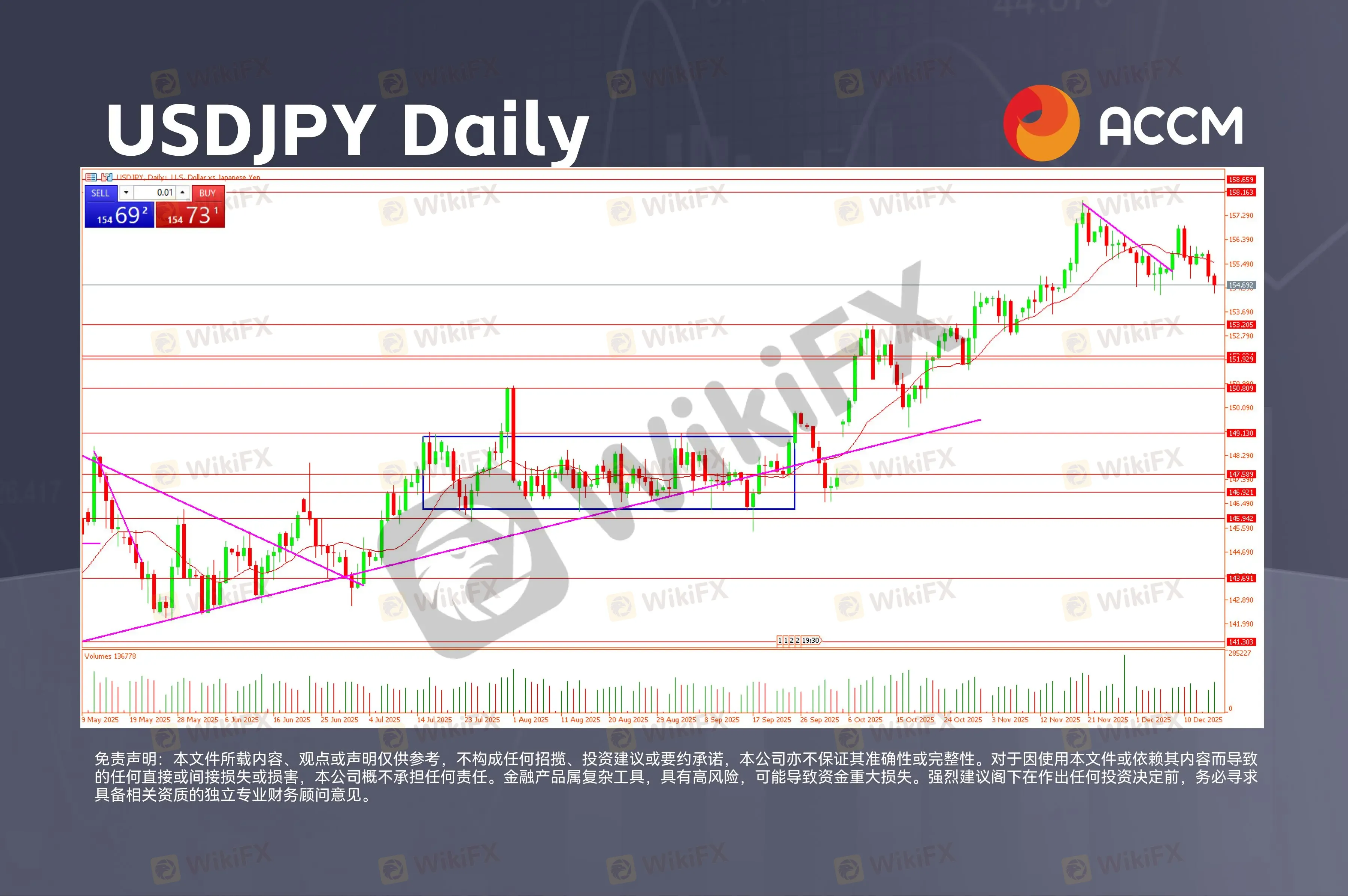 与此同时,USDJPY 跌破155这一重要枢纽位,技术形态显示趋势反转的可能性正在上升。从当前结构来看,下方至153一带之前几乎没有明显支撑,而该区域可能与150日均线(黑线)重合,成为下一道关键支撑区域。
