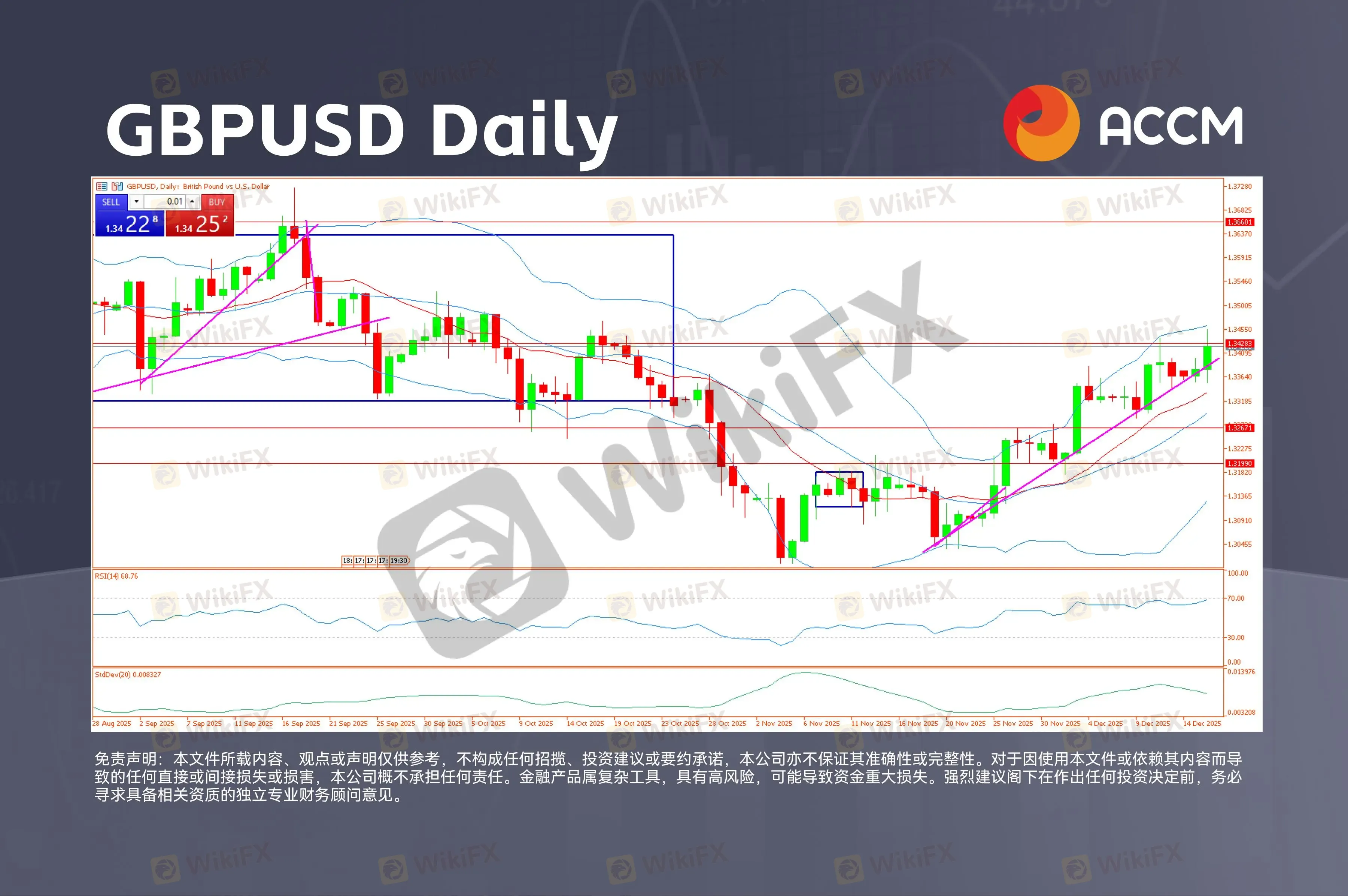 数据公布后,GBPUSD 出现技术性反弹,汇价在150日均线(黑线)、1.3350枢纽位以及上升趋势线附近获得支撑。如果价格能够有效站上200日均线(蓝线)以及1.34关键枢纽位,则有望进一步上破上方的上升趋势线。不过需要注意的是,RSI同样已触及70水平,显示短线处于超买状态,回调风险正在累积。