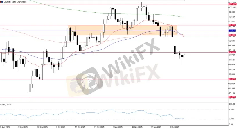 从技术面看,美元指数结构与之前分析一致。跌破98.00显示潜在进一步下行,但价格行为仍暗示反弹可能性。未能重新站上98.00将继续施加短期压力,而在98.80–99.00区间的反弹仍提供“高抛低吸”的机会。