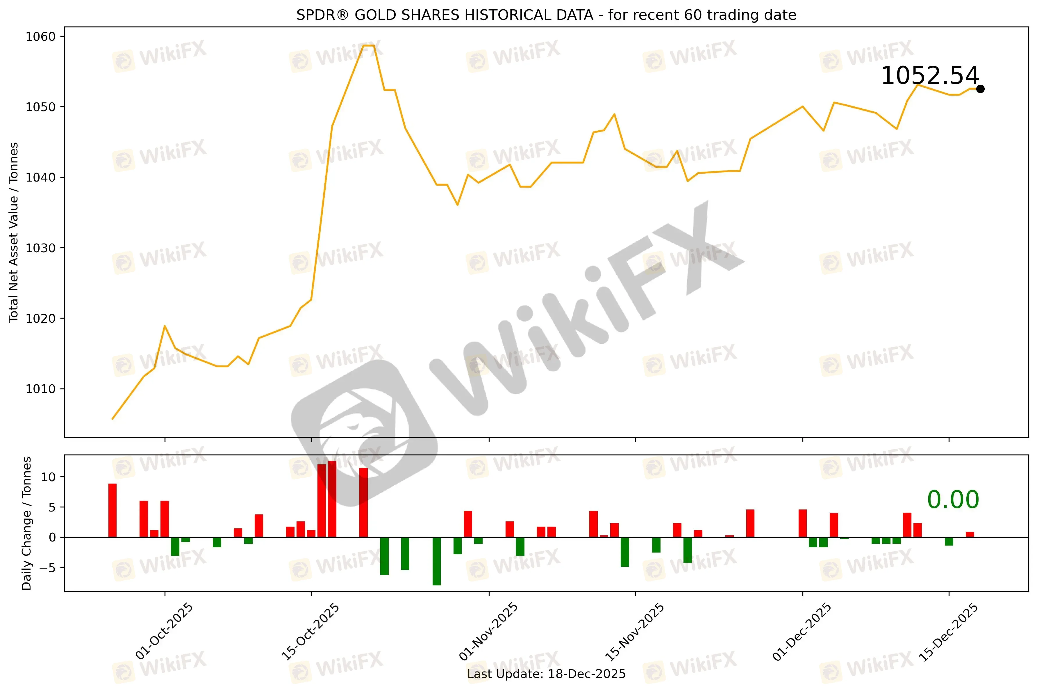 截至12月18日,全球最大的黄金ETF SPDR Gold Trust持仓量为1052.54吨,较上一个交易日维持不变。12月18日现货黄金自4338.83美元/盎司开盘后震荡下行,受消息面影响最低向下触及4308.81美元/盎司,随后迅速反弹拉升至4375.17美元/盎司,接近历史新高后回落至4322美元附近整理,最终收于4332.51美元/盎司,跌6.32美元或0.15%。