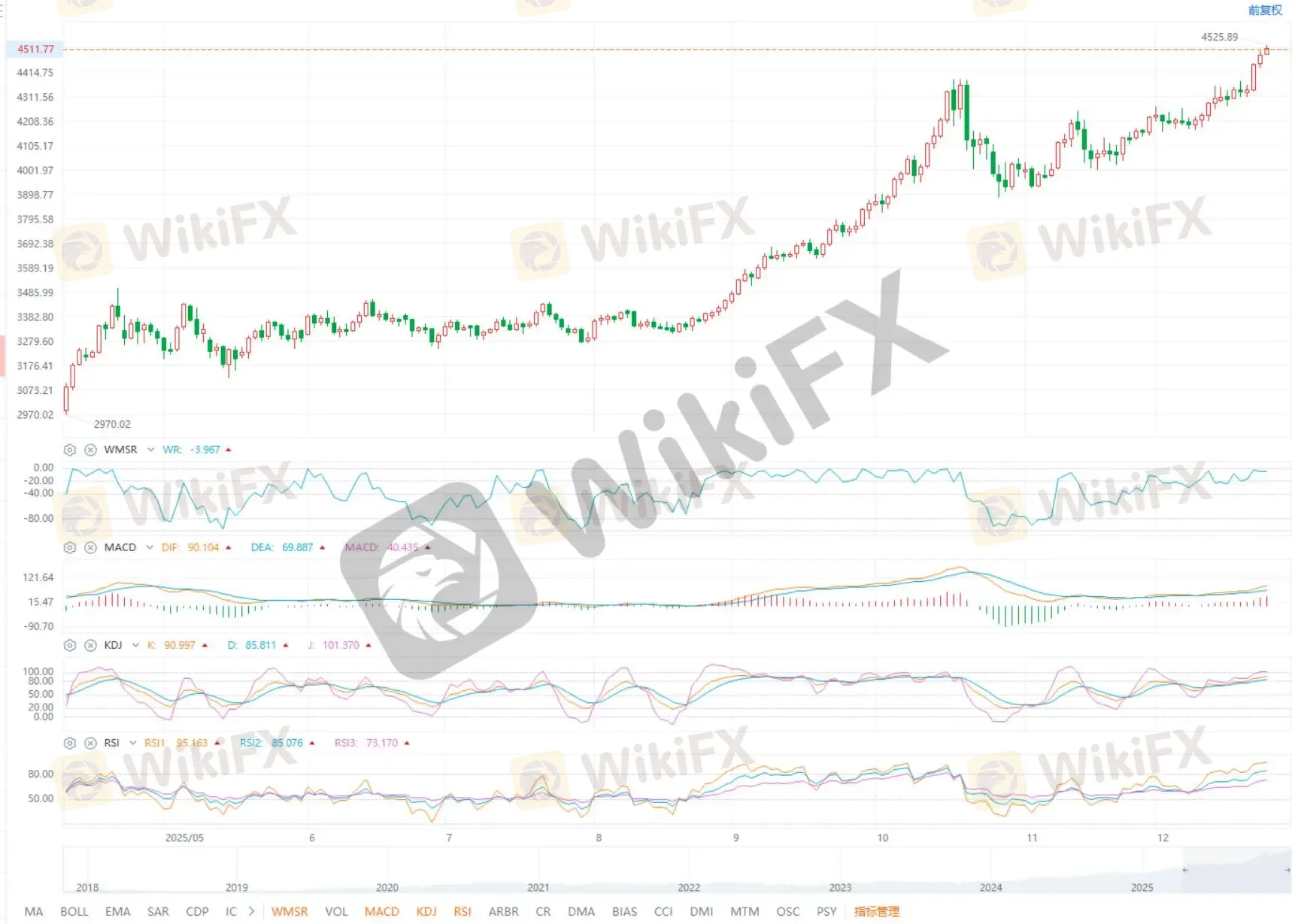 周三(12 月 24 日),现货黄金涨势进一步扩大,盘中史上首次站上 4500 美元/盎司关口,今年以来累计涨幅已超过 70%,贵金属整体行情处于加速状态。