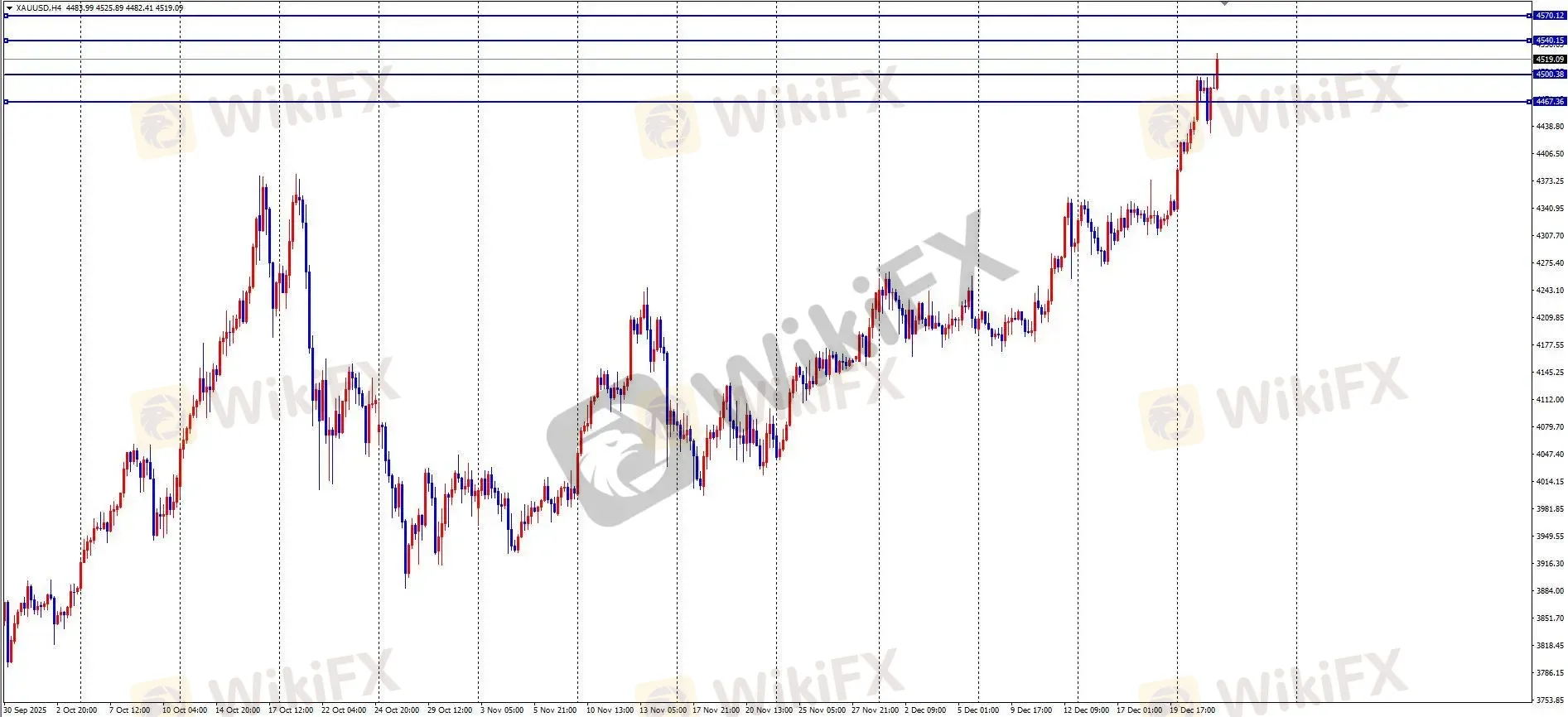 摘要:XAU/USD昨日回顾与ETO Markets观点:周二,黄金价格在亚盘跳空高开并快速上涨,逼近 4500 关口,随后于欧盘横盘震荡,美盘加速下行至 4430 附近后快速企稳回升,收盘前再次触及 4500。全日波幅约 695 点,日线收带上下影线的阳线。在全球经济不确定性与地缘政治波动背景下,黄金于圣诞前夕呈现强势。ETO Markets 提醒,目前日线级别已出现背离信号,且连续两日上涨后昨日动能