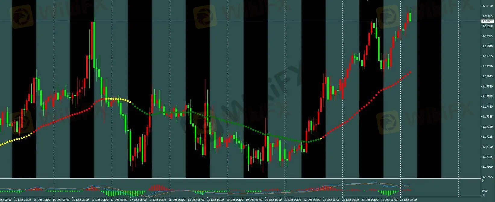 H1 趋势线维持红色,按模型已在 1.1762 附近入场多单。保护性止损设于 1.169 下方,盈利目标为开仓价上方 50 点,趋势线转绿即平仓。