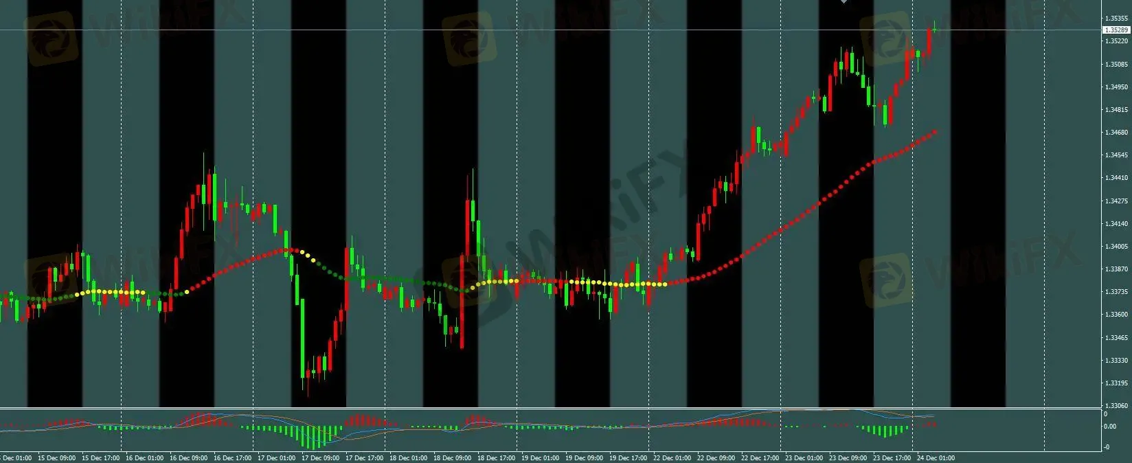 H1 趋势线保持红色,前期 1.338 附近多单已达成盈利目标。今日可参考 M5 综合模型进行日内短线交易。