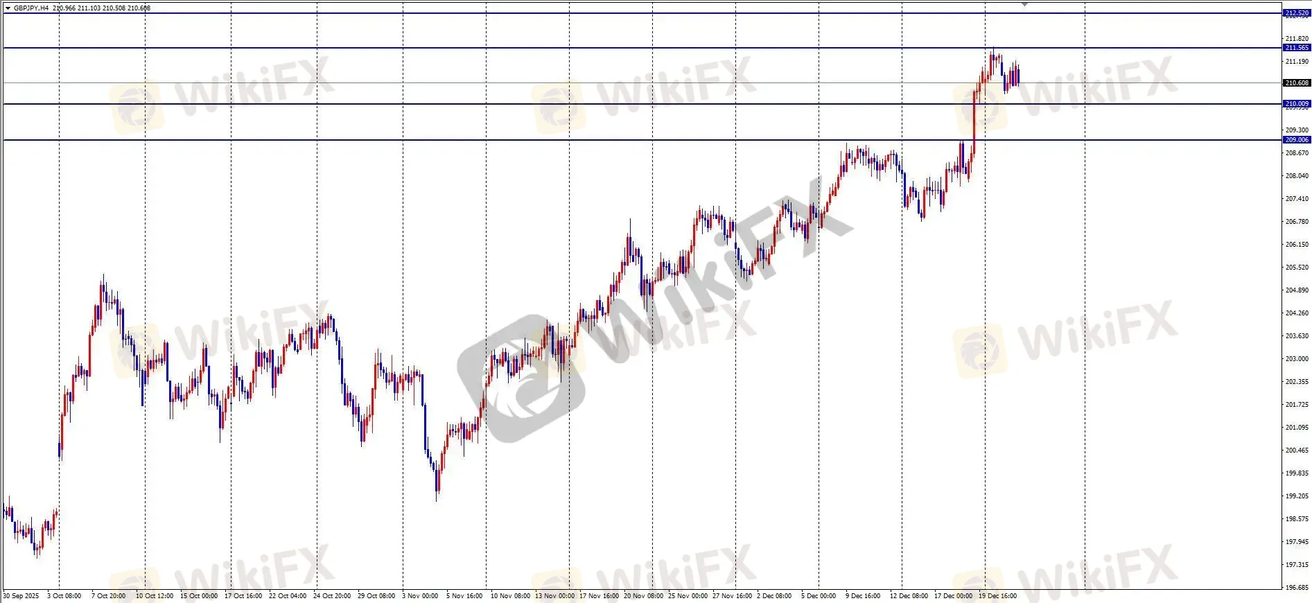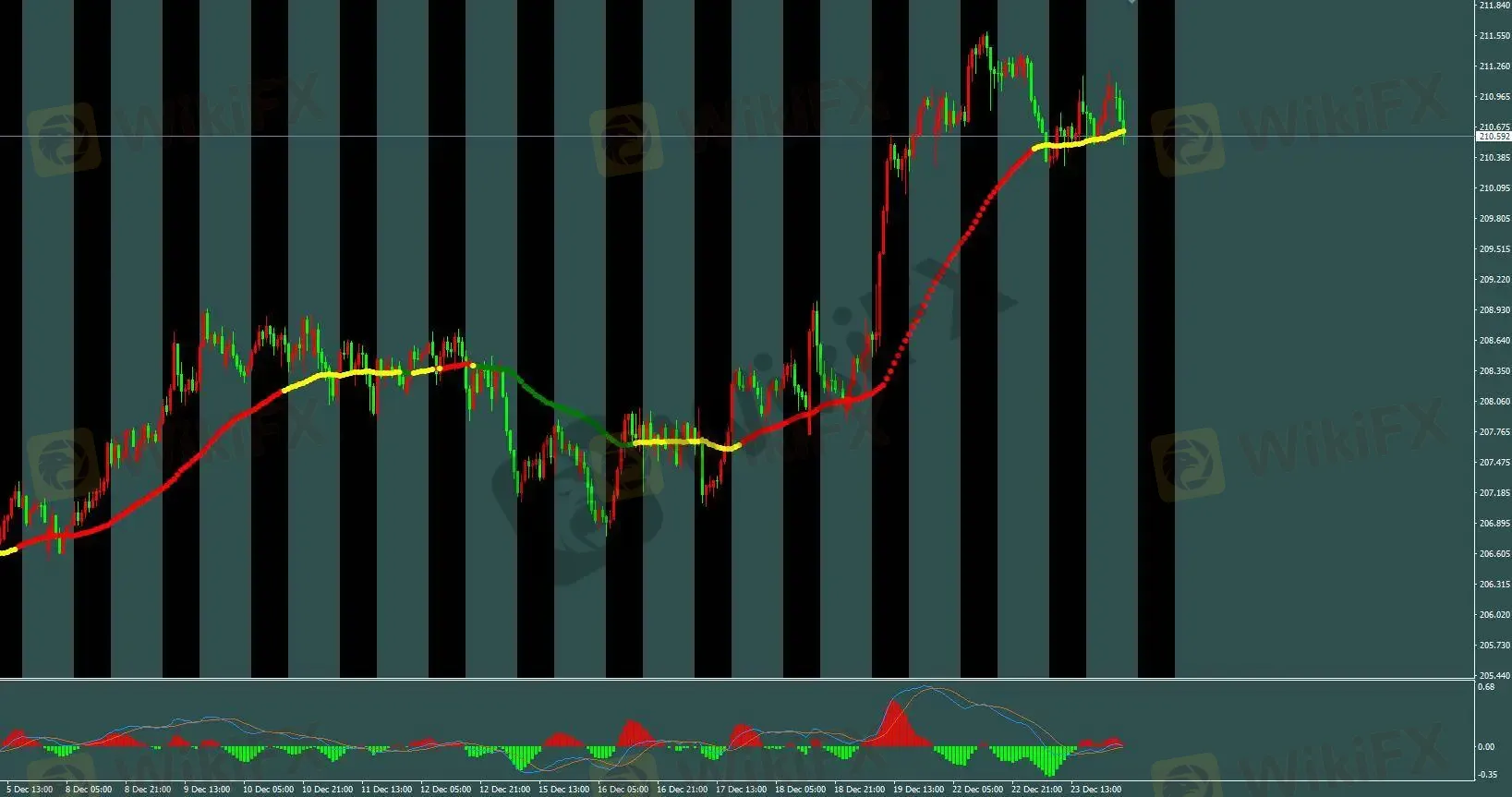 周二,英镑/日元亚盘跳空低开后快速下行,下破前低,欧盘横盘整理,美盘企稳回升并创日内新高至 211.2 附近,全日波幅约 107 点,日线收长下影类十字阴星。ETO Markets 分析,当前多头进入调整,4 小时 MACD 死叉处于高位,1 小时 MACD 进入 0 轴下方。若 210.3 支撑下破,价格可能进一步回调至黄金分割 38.2% 与 50% 位置,建议回调后逢低布局多单。