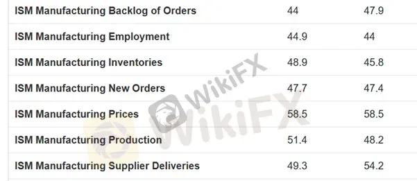 ISM制造业PMI数据的细分项目看,产出指数从51.4下降至51,支付指数保持58.5不变;就业指数从44升高至44.9,库存指数从48.9下降至45.2,新订单指数从47.4升高至47.7点。综合来看,三个细分项目出现下降,其中库存指数降幅最为显著,两个项目出现回升(但绝对值仍处于50荣枯线下方),一个项目保持不变。这些数据的发布,加剧了市场对美国制造业的悲观态度,利空美元指数。