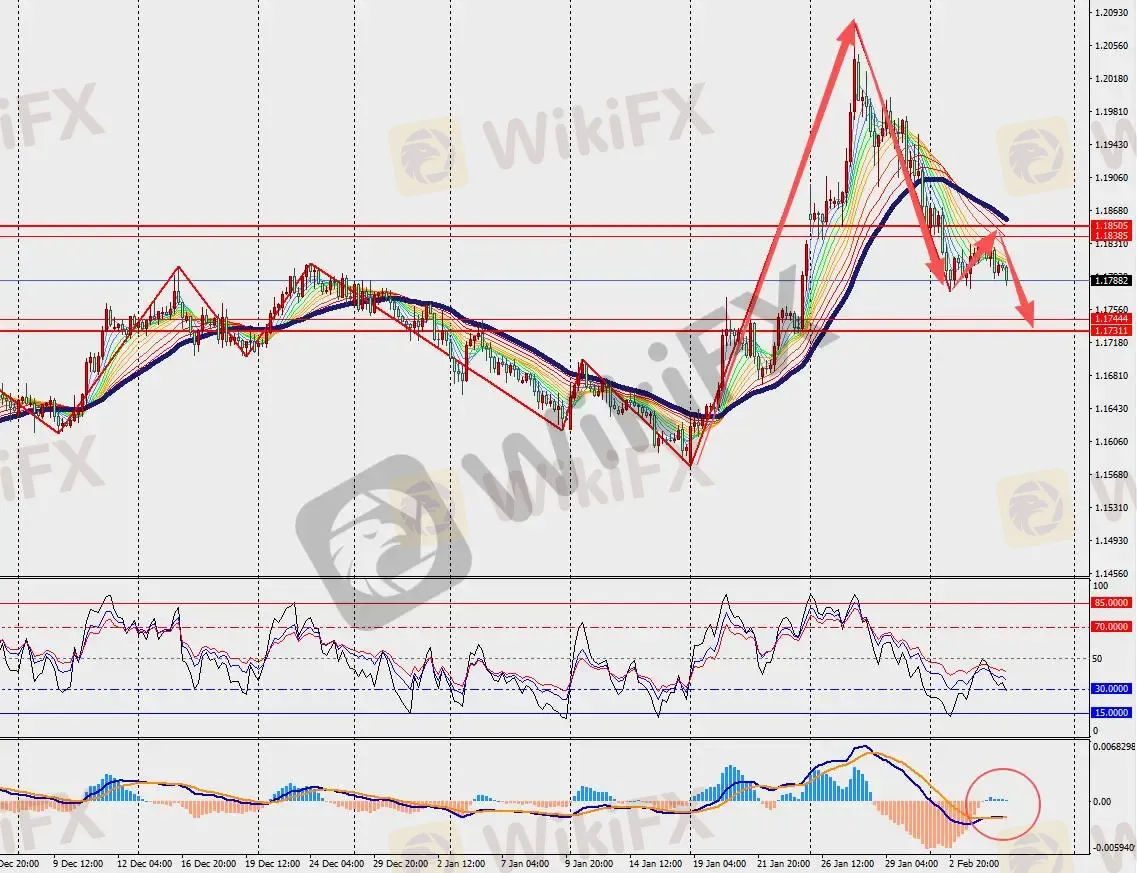 技术面:英镑兑美元H4级别震荡下行,并在48日多空分界线下方运行。此外,MACD双线和量能柱在零轴附近扩张。英国劳动力市场前景再次释放出悲观信号,1月企业招聘下降速度加快,企业正试图通过此举抵消不断上升的用工成本。