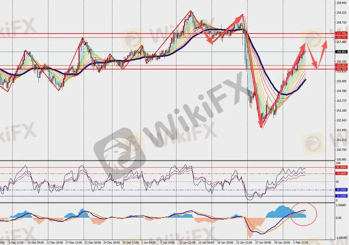 技术面:美元兑日元H4级别持续上涨,并在48日多空分界线上方运行。另一方面,MACD双线和量能柱在零轴上方缩量。日本央行只有在投机交易引发的恐慌性抛售,或市场陷入需由央行担任最后市场造市者的失序状态时才会介入,目前并未出现这些情况。