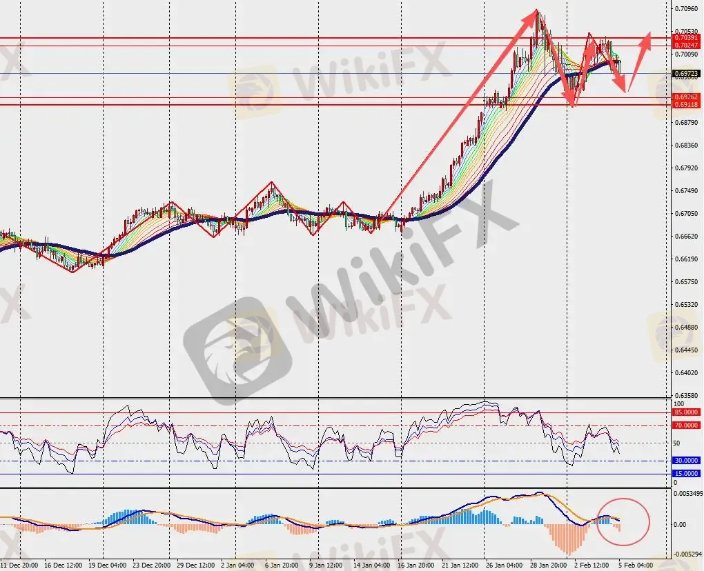 技术面:澳元兑美元H4级别震荡下行,并在48日多空分界线下方运行。此外,MACD双线和量能柱在零轴上方扩张。在澳洲四大银行中,唯有澳新银行预计利率从现在起将长期处于停顿状态。