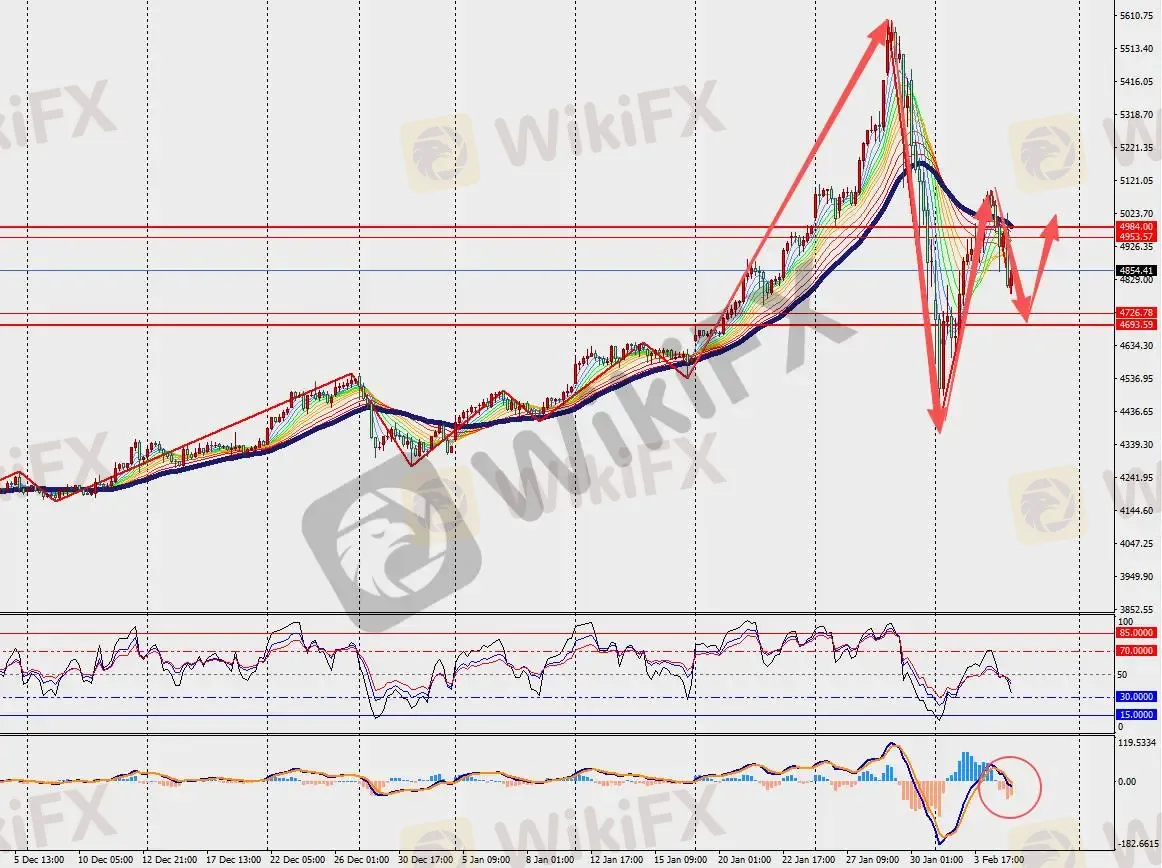 技术面:黄金H4级别再次回落,并在48日多空分界线下方运行。此外,MACD双线和量能柱在零轴附近收敛。尽管黄金价格较其历史高点仍下跌了7%,但其在过去一年中上涨了71%。