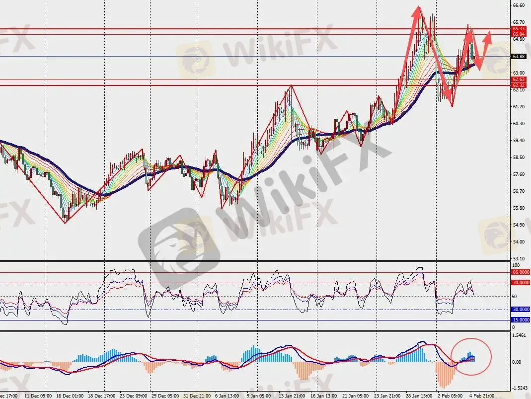 技术面:原油H4级别震荡回落,并在48日多空分界线附近运行。此外,MACD双线和量能柱在零轴附近缩量。市场情绪因华盛顿与德黑兰之间紧张局势有望缓和而发生转变。但其具体谈判挑战依然存在,料将限制油价下行空间。